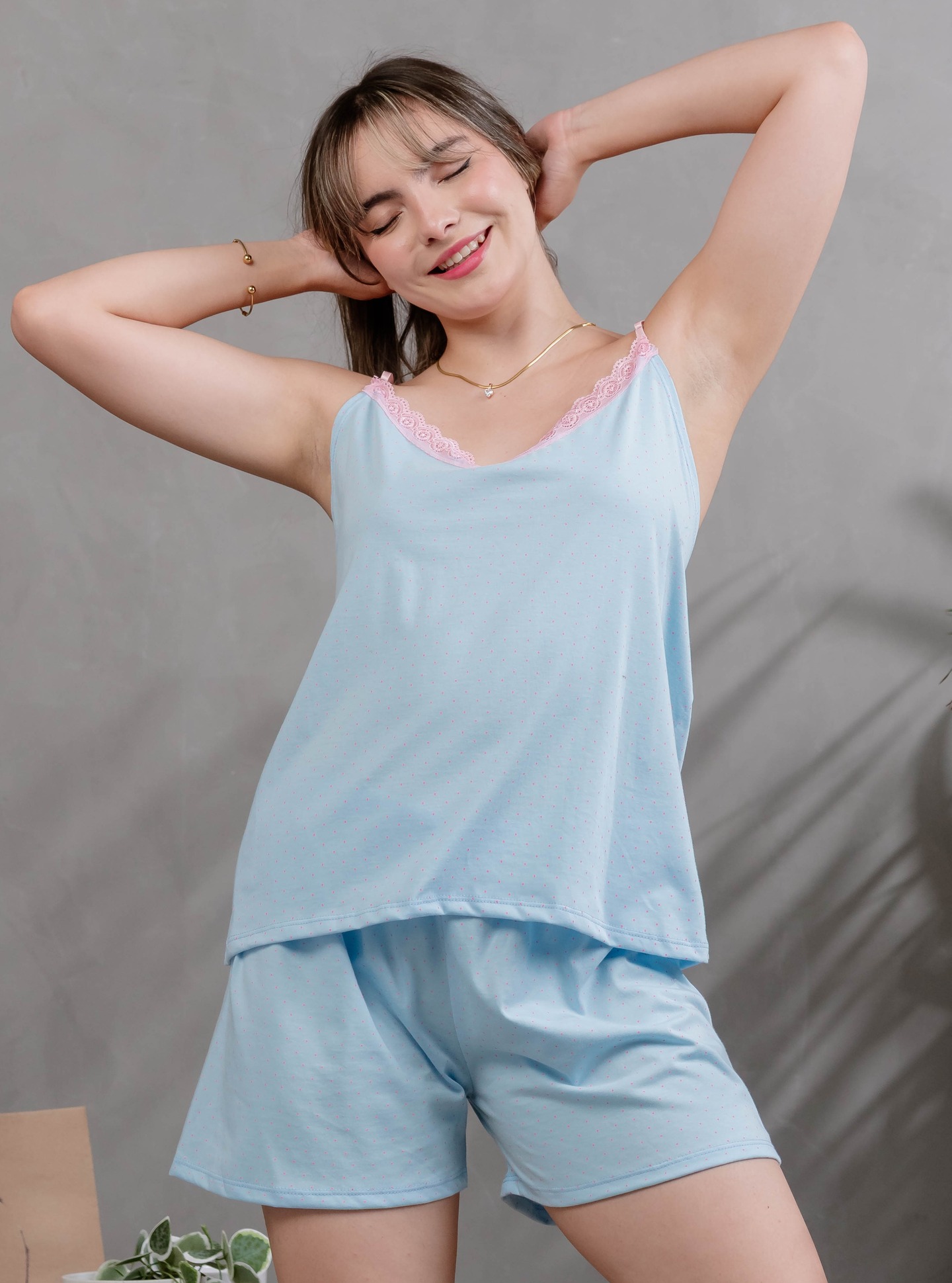 La tela de nuestr0 pijamas son perfectas para mantener la comodidad y frescura, ya que nuestras telas son peinadas y brindas una mayor confort a la hora de dormir por su suavidad al tacto, su lindo estampado en puntos que resalta la elegancia y simpleza.